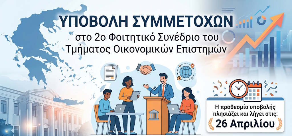 Υπενθυμίζουμε στους φοιτητές και τις φοιτήτριες του Τμήματος ότι οι αιτήσεις για το 2ο Φοιτητικό Συνέδριο του Τμήματος Οικονομικών Επιστημών 2026 συνεχίζονται.